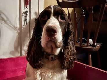 Stache (named for mustache marking on the left side of her face) is in the running for the most affectionate Graystone Springer. She's always so happy to see everyone. She's spunky and energetic, but perfectly happy to curl up on the couch with my Dad and watch TV. Daughter of Ebony and Levi, she has one of the more mellow personalities. Sweet and calm like her mother. Ready to go like her father. A happy mix of everything you love about a Springer. Though she has been caught chewing up paper towels into little bits....but I think it's just to keep my dad busy.